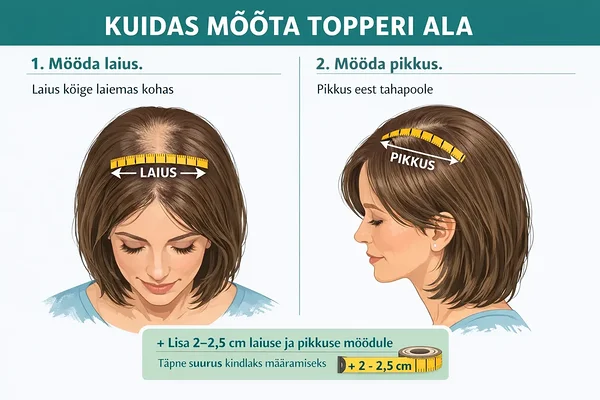 Topper kinnitatakse surveklambritega. Et klambrid kinnituksid tugevamatesse ja tervematesse juustesse, lisa nii laiuse kui ka pikkuse mõõdule 3/4” kuni 1”. Nii saad teada topperi suuruse, mis sobib sulle kõige paremini.